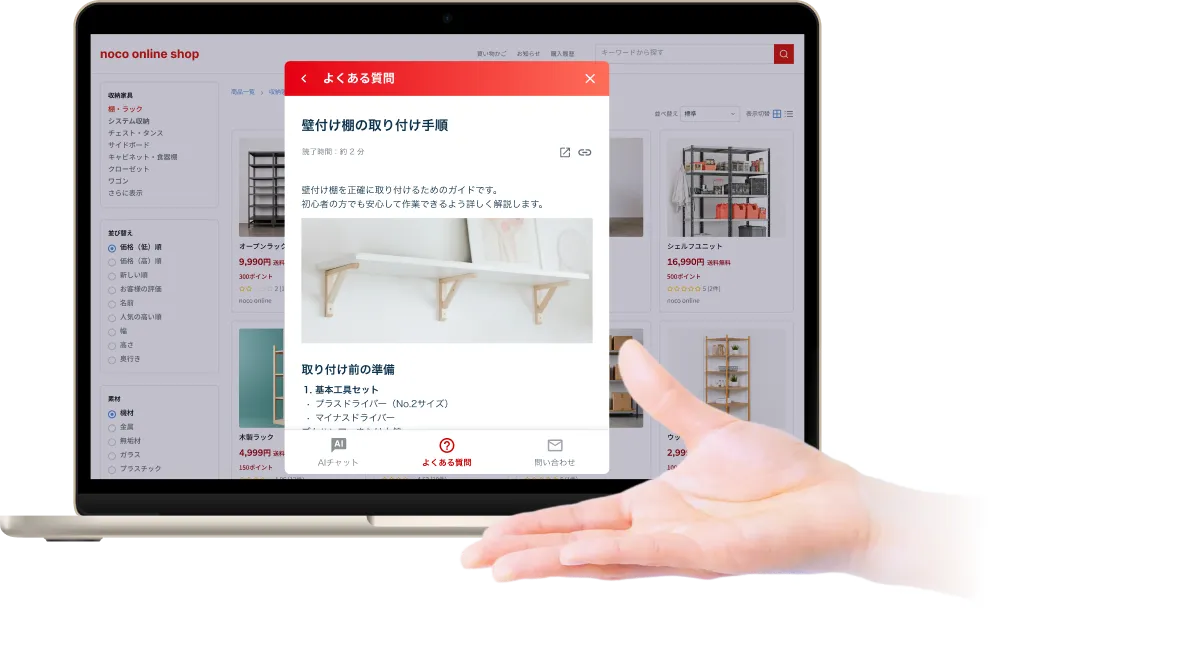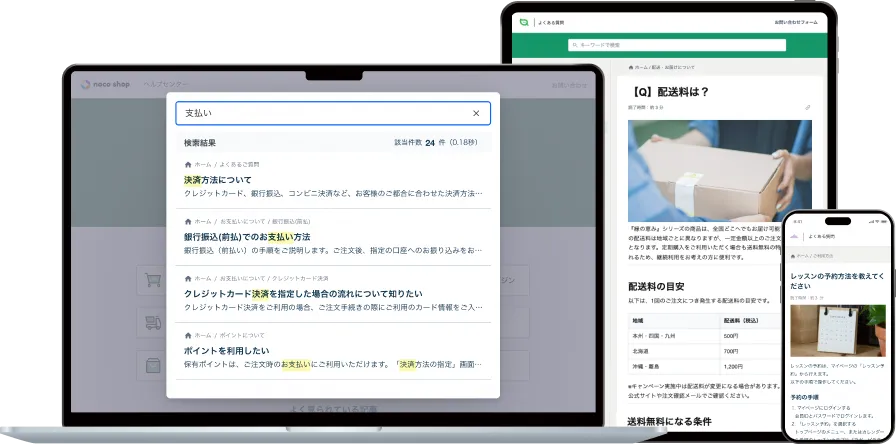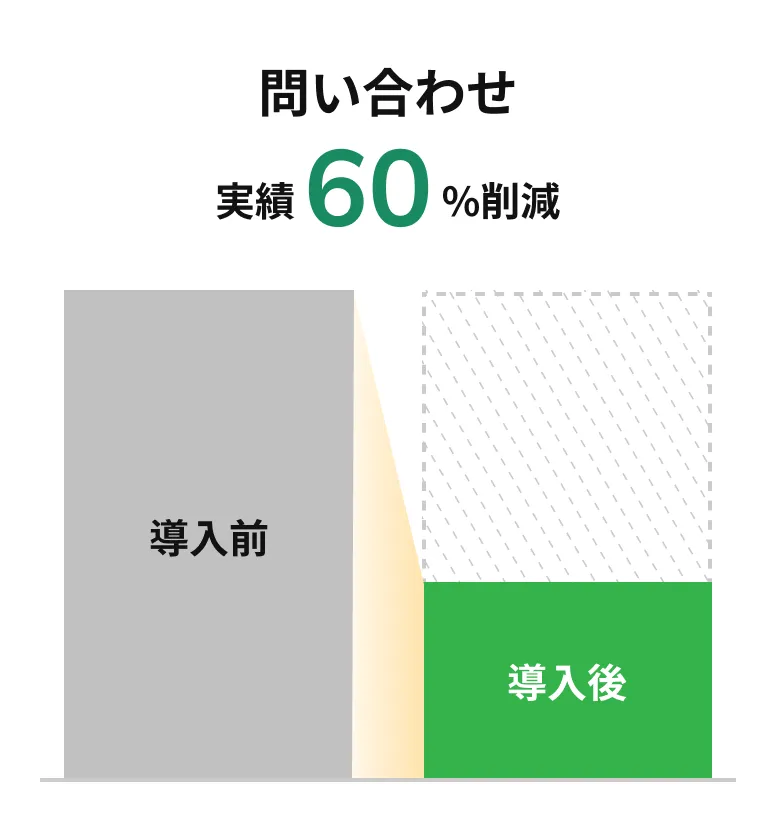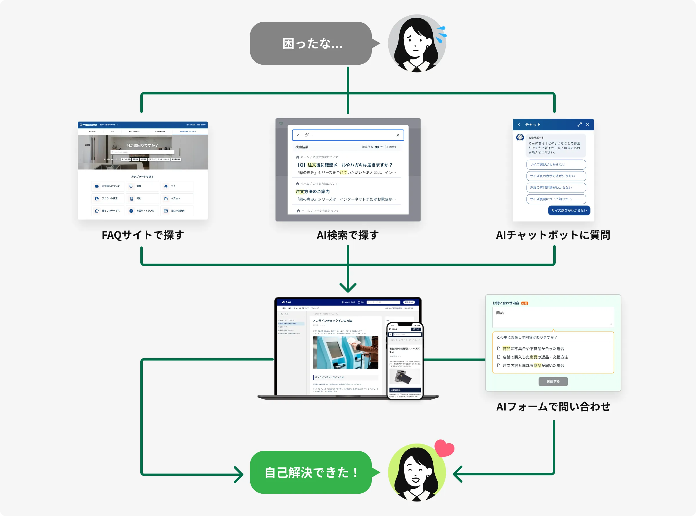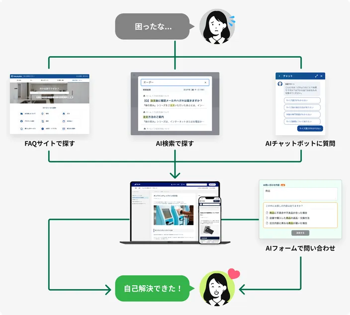 お客様や従業員が FAQサイトを見たり、AI検索 や AIチャットボットに 質問しながら、疑問をその場で自己解決できます。また、 AIを搭載した問い合わせフォーム が解決に導く記事を案内するため、問い合わせを減らし、サポート業務の負担を軽くします。