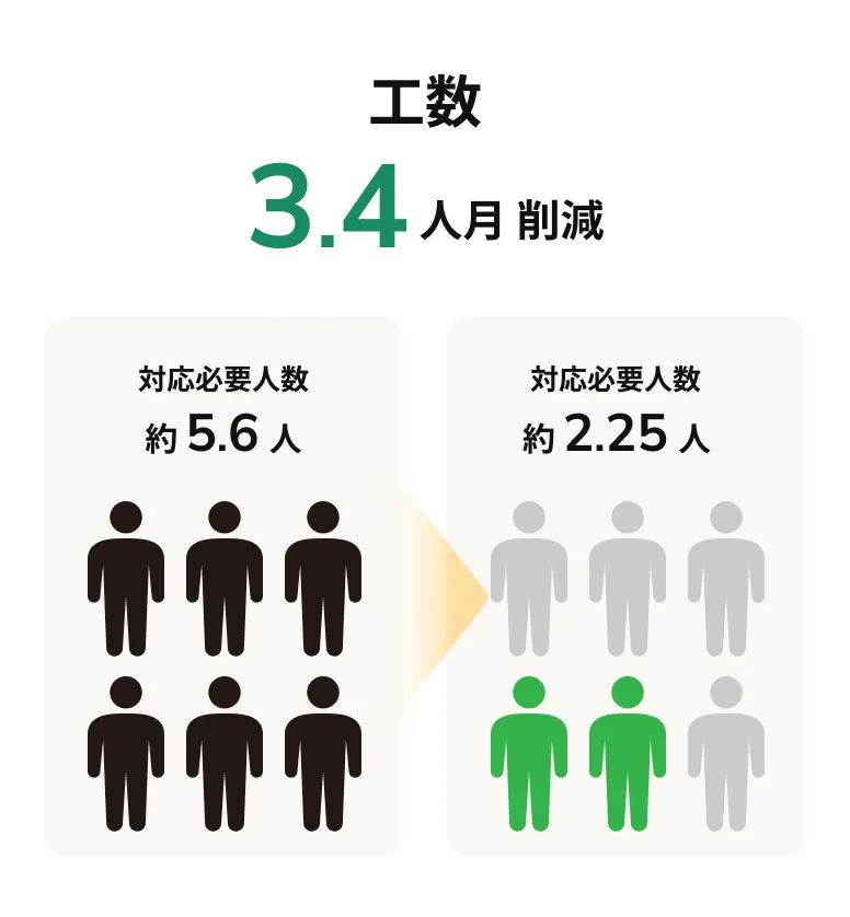 削減効果「約3.4人月分の業務削減」の試算は、月間の問い合わせ件数を3,600件、削減率を60%の実数をもとに、1件あたりの平均対応時間を15分と仮定したうえで算出しています。また、1名あたりの稼働時間は1日8時間・月間20営業日(計160時間)とし、対応工数の削減量を人月換算しています。以上の前提に基づき、削減件数2,160件に相当する月間対応時間は約540時間、これは約3.4人月分の工数削減に相当します。