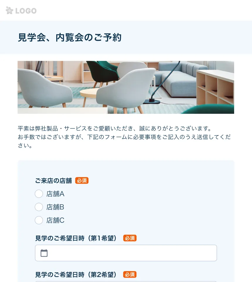 見学会・内覧会の予約を受け付けるためのフォームです。顧客から、見学希望や内覧希望の予約を受ける場合に、ご利用ください。