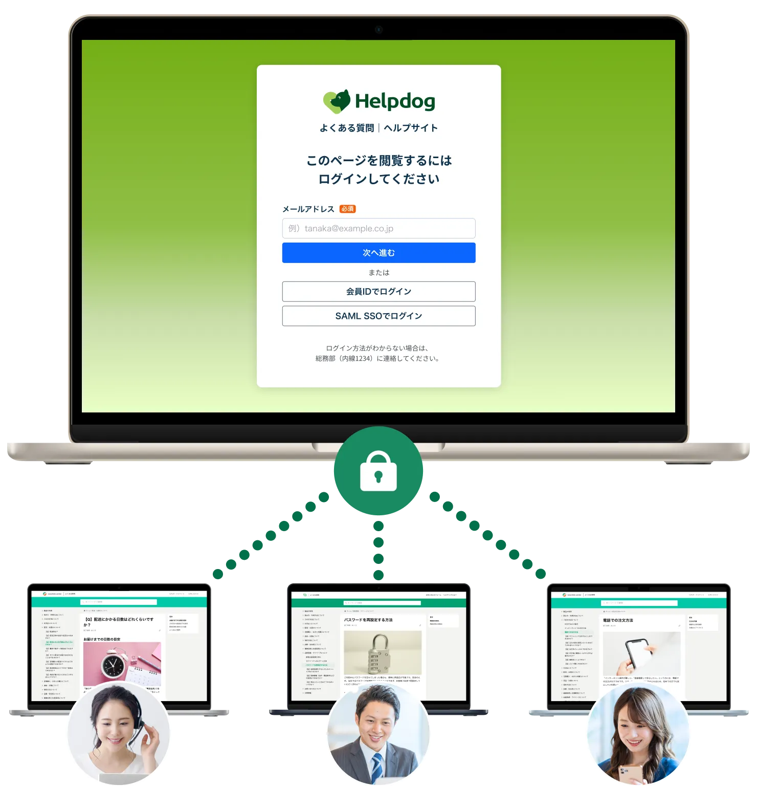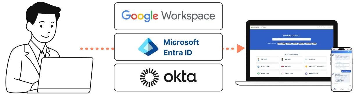 社内で利用している認証基盤(IdP)と連携することで、 一度のログインでヘルプドッグをご利用いただけます。
