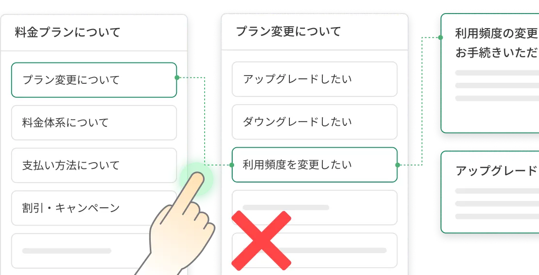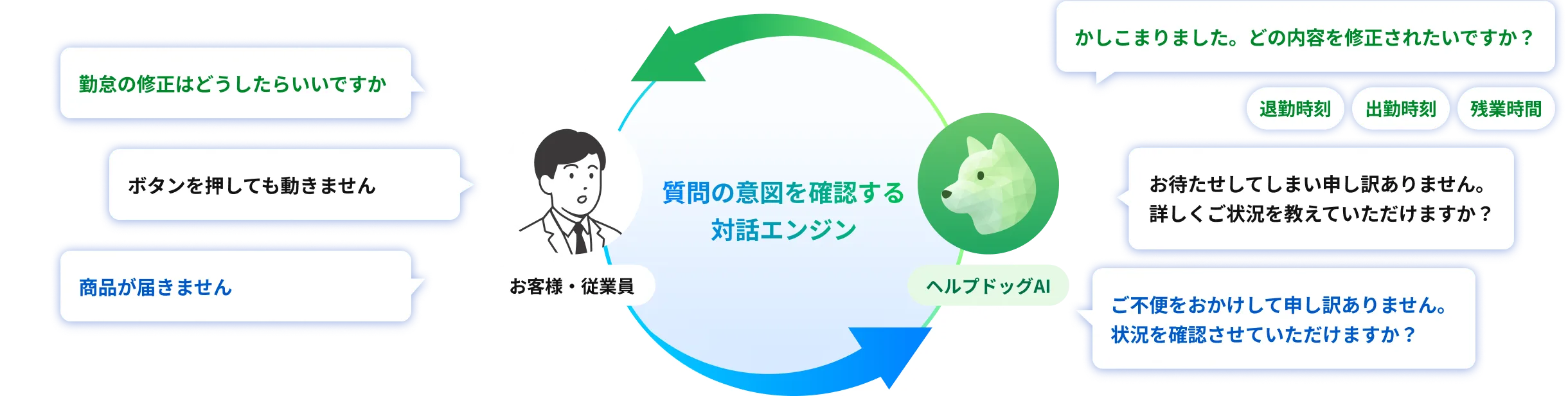 お客様の意図を汲み取りながら質問を聞き返し、正確な回答を返すことで、曖昧な質問でも誤った回答を行う「ハルシネーション」を防ぎ、信頼できるサポートを実現します。さらに、会話の雰囲気や言葉づかいを利用シーンに合わせて整えられるため、人との対話に近い自然さと一貫性のあるサポート体験を提供します。