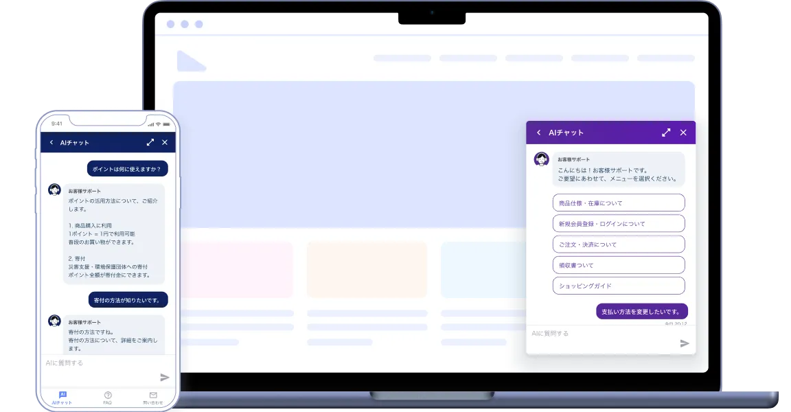 自然な会話体験を提供する「生成AI型」と、FAQやマニュアルの中から最適な情報を提示する「AI検索型」の2種類を用意。用途に合わせて、最適なサポート体験を提供します。