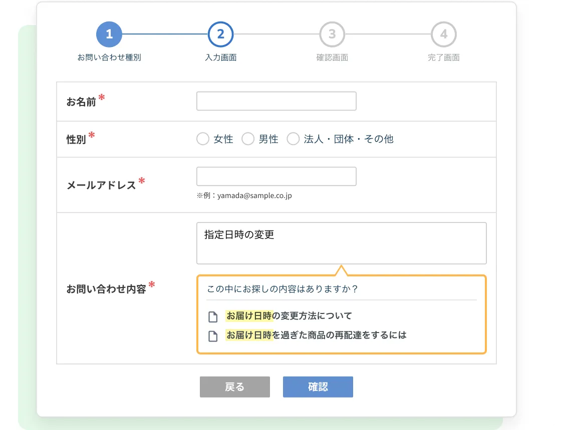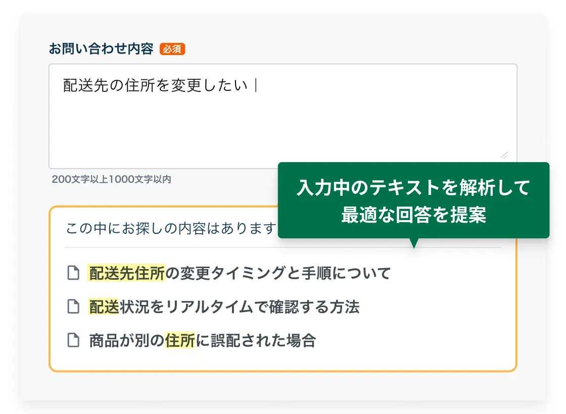 フォーム入力中に回答を即座に提示することで、顧客のストレスを軽減し、スムーズなサポート体験を提供します。