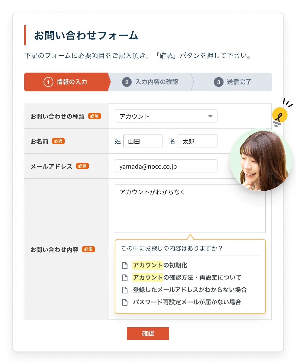 フォーム入力時に適切な解決策をリアルタイムで提案し、顧客が自己解決できる環境を整え、問い合わせの件数を減らします。