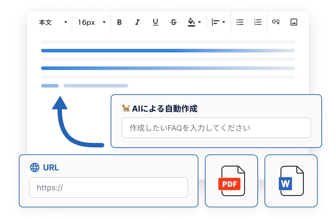 PDFやWordファイルのアップロード、ウェブサイトのURLを指定するだけで、AIが記事を自動生成します。内容を理解してカテゴリ分けまで行うため、初期構築がすぐ完了します。
