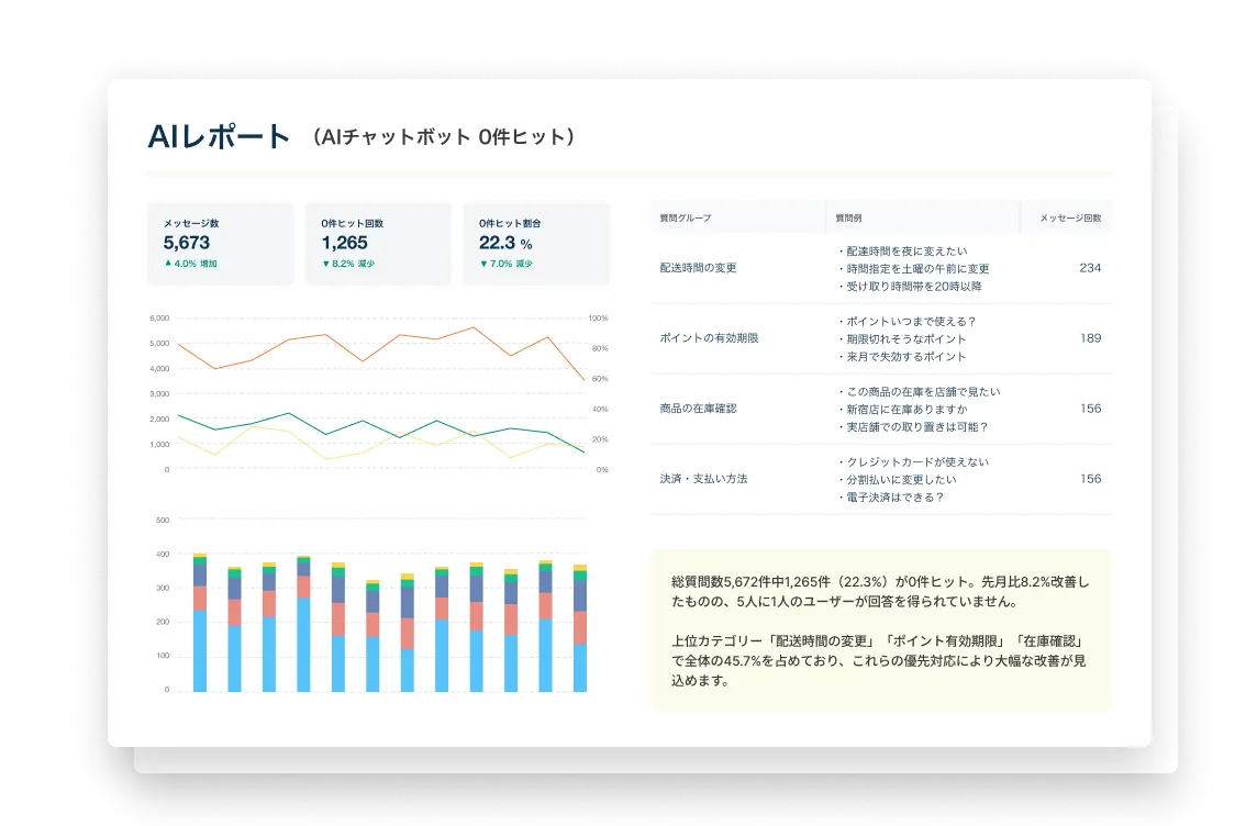 FAQサイトやAIチャットボットの利用状況や検索動向、問い合わせ件数などをAIが自動で分析。 課題の特定、改善アドバイスをまとめたレポートを毎月自動で作成し、報告作業の手間を大幅に削減します。