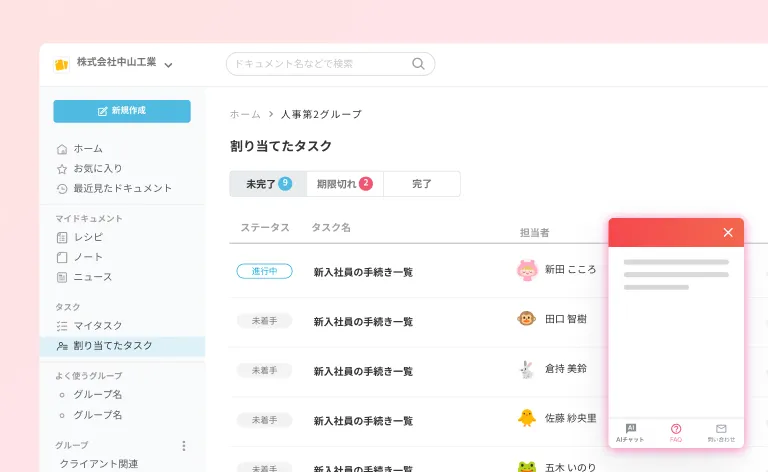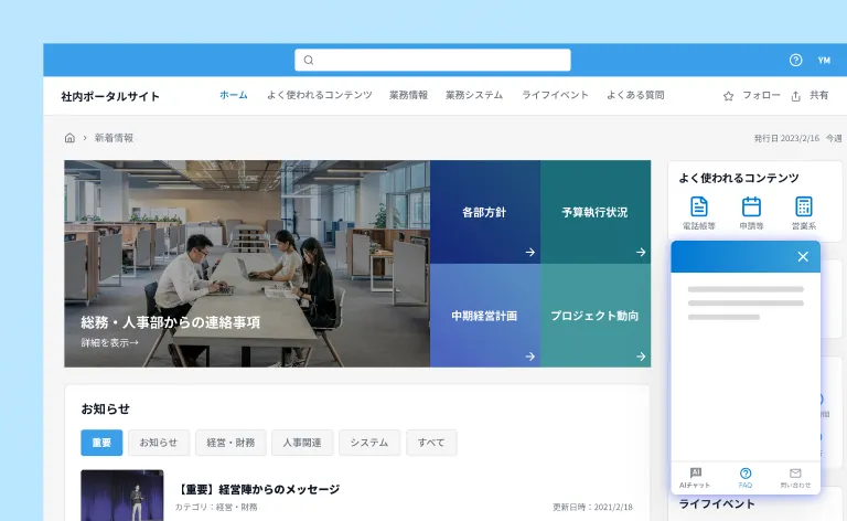 社内ポータルサイトやイントラネットに組み込むことで、社員から各部署への問い合わせを減らし、全体の業務効率を高めます。