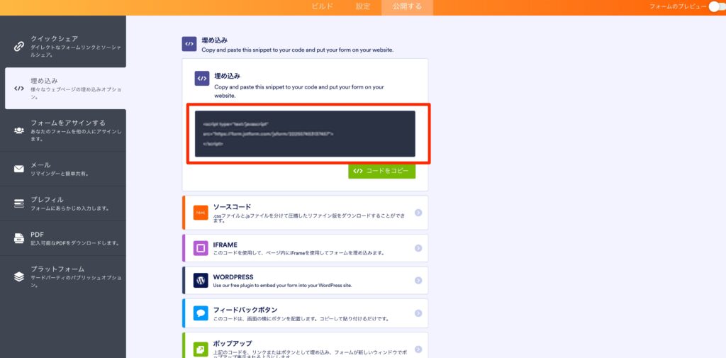 サイトにフォームを設置したい場合には「埋め込む」を選択し、作成されたコードをコピーしてサイトに貼り付けてください。