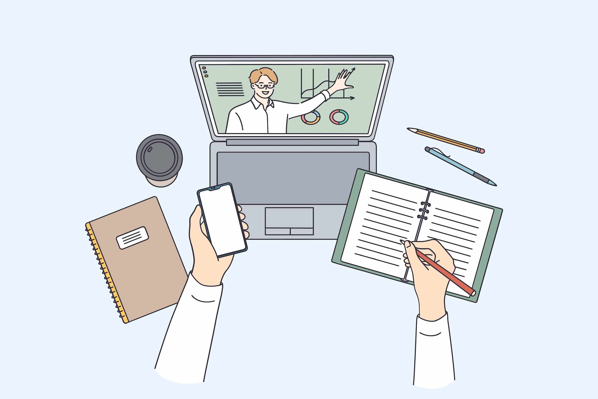 オンラインで講師の説明を受けながらノートに記録する学習スタイル