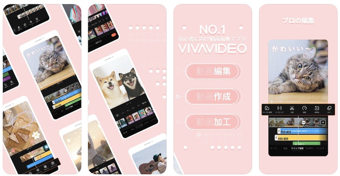 | 主な機能 | 撮影・トリミング・分割・結合・クロップ・トランジション効果・フィルター効果・エフェクト効果・テロップ挿入・音楽挿入・録音・オーディオ調整・動画の速度調整・動画のエクスポート・ステッカー挿入 |
