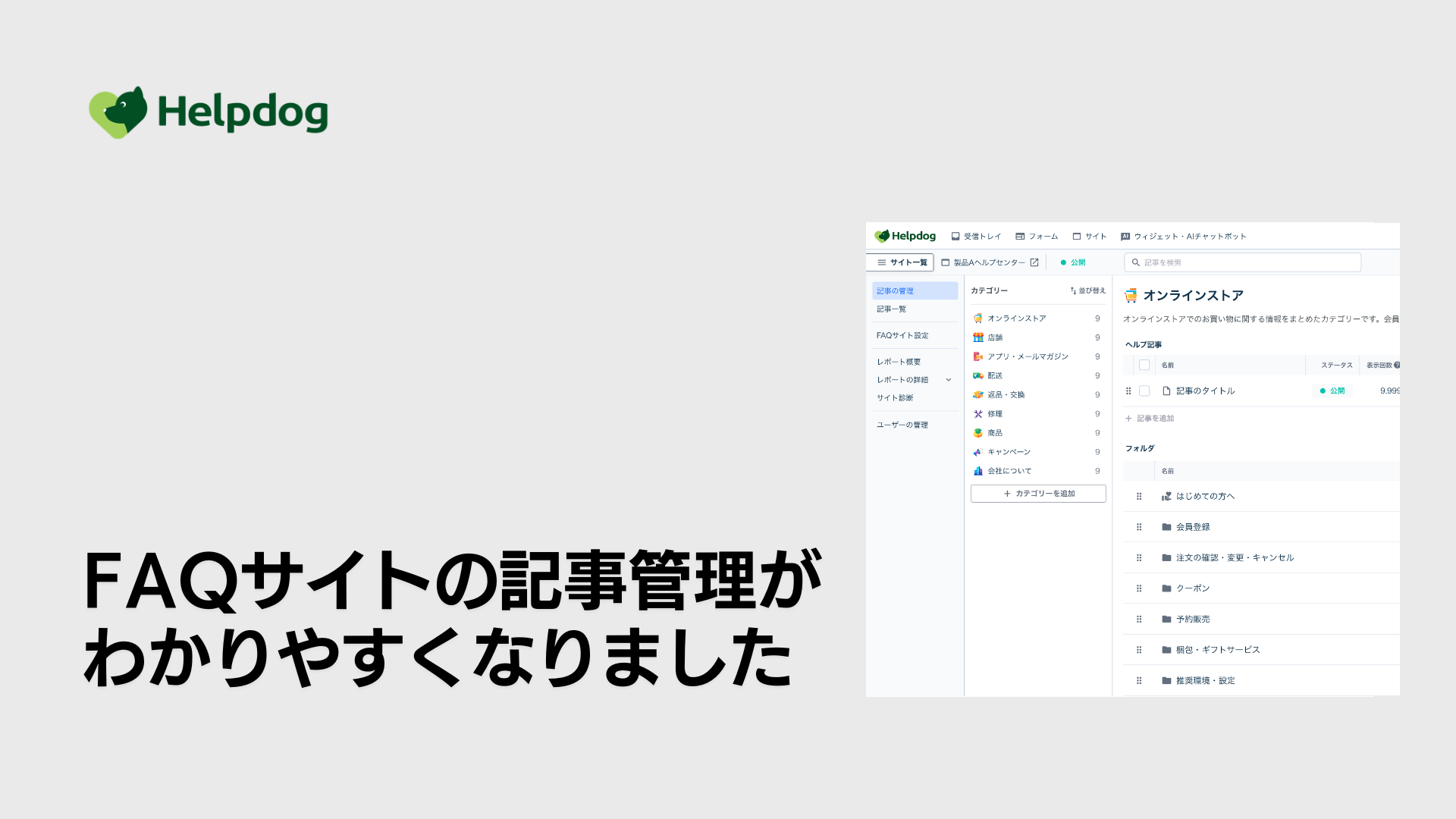 ヘルプドッグは、FAQサイトの記事管理画面のアップデートを実施しました。今回のアップデートでは、管理画面のUIおよびテキスト表現を見直しました。カテゴリやフォルダの詳細画面を中心に構成を整理し、記事やフォルダの操作をより分かりやすく行えるよう改善しています。