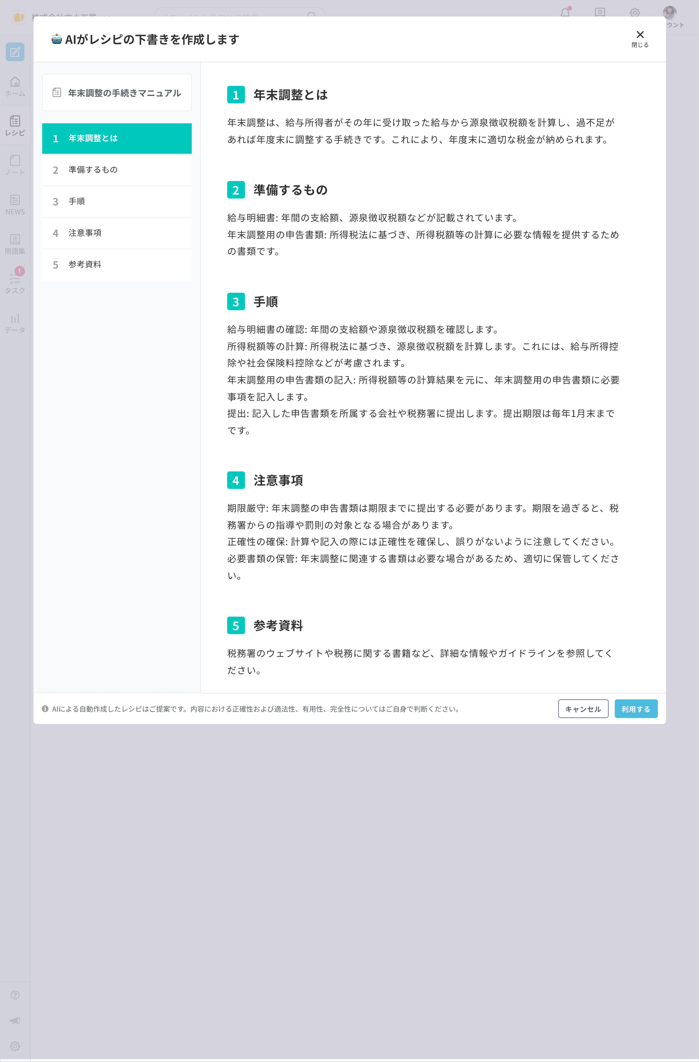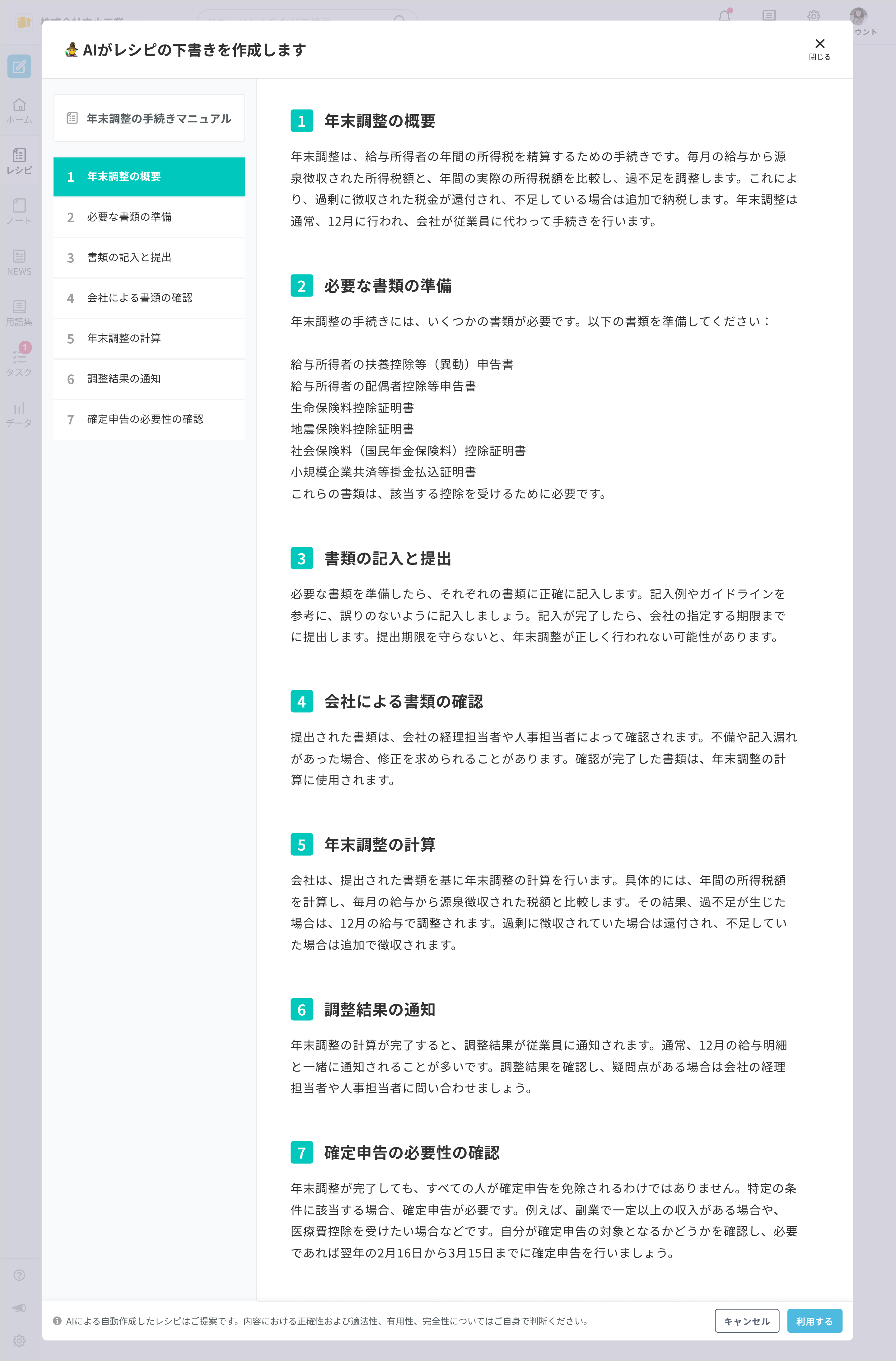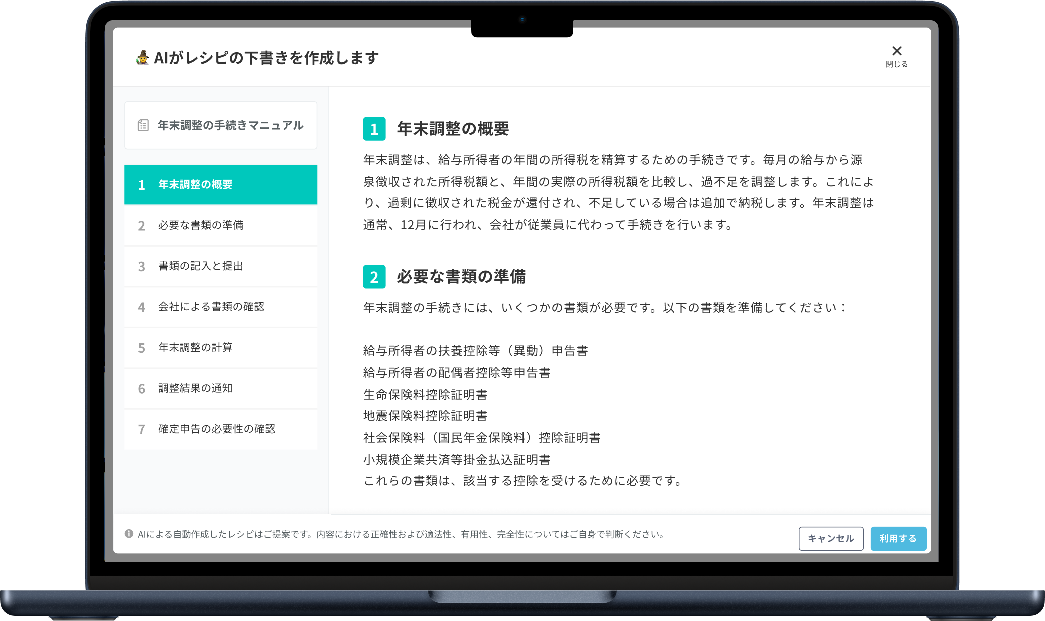 業務マニュアルの作成は、正確で包括的な情報を収集し、文章の構成や見出しの配置、図や表の作成、簡潔で要点を押さえた説明など、マニュアル利用者が理解しやすい文章や形式にまとめる作業や経験が必要なため、多くの企業ではマニュアルの作成にかかる時間とコストが大きな負担でした。これらの課題を解決するため、「トースターチーム」では業務マニュアルのタイトルを入力するだけで、数秒でステップ形式の構成と見出し、マニュアル本文を自動で作成する「AIマニュアル自動作成機能」を2023年5月に提供し、マニュアル作成の自動化および作成にかかる時間とコストの削減を実現しました。店舗の運営マニュアルや製造現場の管理マニュアル、総務や経理、財務、人事、労務などのバックオフィス業務に関するマニュアルなど、さまざまな部門で活用されています。