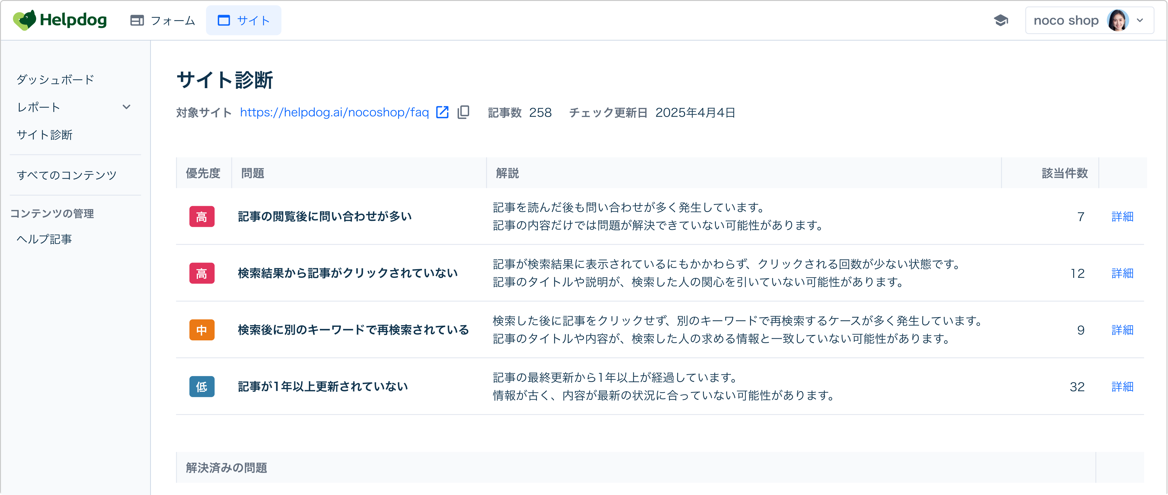 FAQは公開後の運用フェーズでの改善が不可欠ですが、多くの企業では「どのFAQが読まれていないか」「どの検索語が解決に至っていないか」といった分析が手間であり、放置されがちです。ヘルプドッグは、日々の検索ログや閲覧データをAIが自動で解析し、検索されたにも関わらず解決されなかったキーワードや、未整備のトピックなどを抽出します。さらに、改善の優先度を提示することで、現場担当者の作業効率を高めながら、コンテンツの継続的な最適化を支援します。