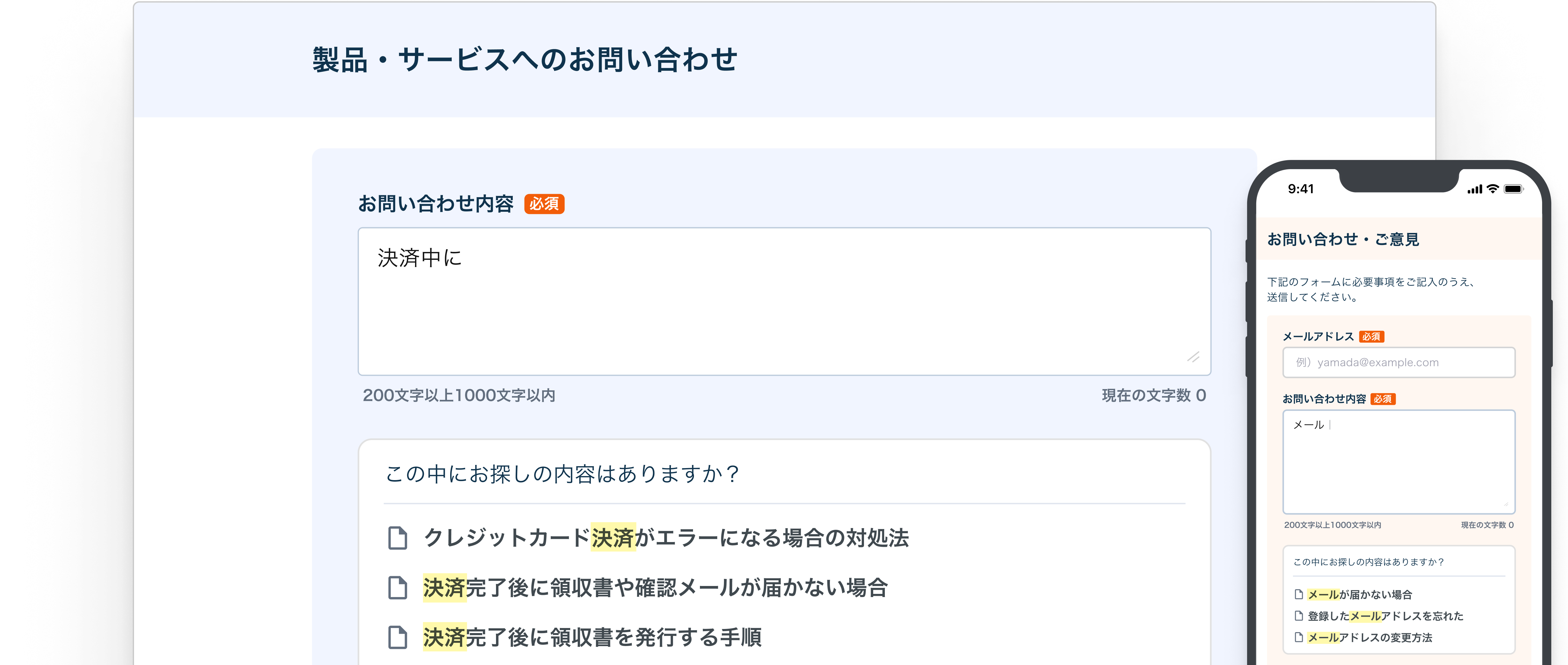 問い合わせフォームからの送信前に自己解決を促すことは、問い合わせ件数の削減に直結します。しかし従来は、フォームとFAQが分離されており、問い合わせを送信するしか選択肢がない設計が一般的でした。ヘルプドッグでは、フォームに入力された文面を自動で解析し、該当する可能性のあるFAQ記事をその場で提示します。これにより、顧客は送信前に解決策を確認でき、不要な有人対応を抑止することが可能になります。特に、よくある質問や基本的な操作案内に関する問い合わせを自己解決へ誘導することで、サポート負荷を効果的に低減できます。