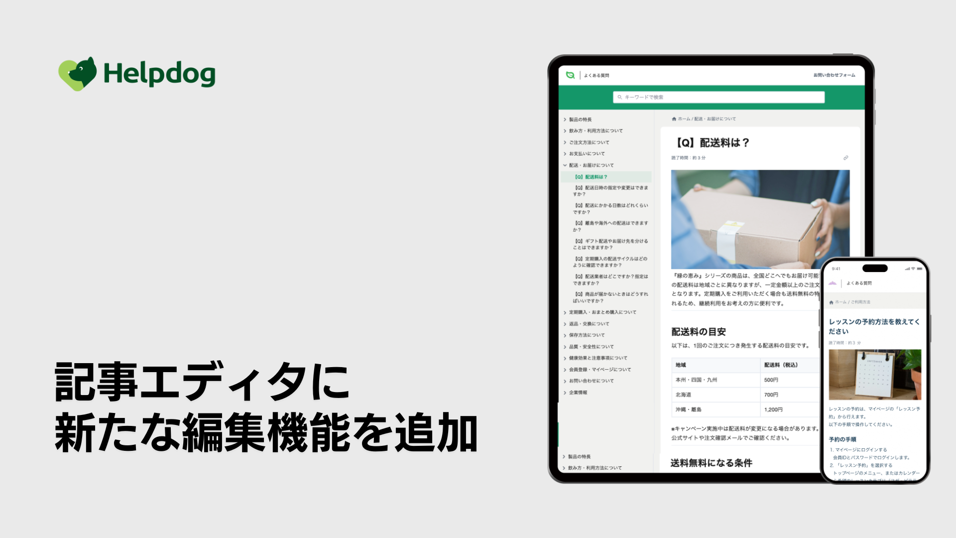 セルフサポートシステム「ヘルプドッグ」は、FAQサイトの記事作成を支援する機能として、記事エディタに「補足ブロック(コールアウト)」および「折りたたみブロック(アコーディオン)」を追加し、2026年1月21日より提供を開始しました。
