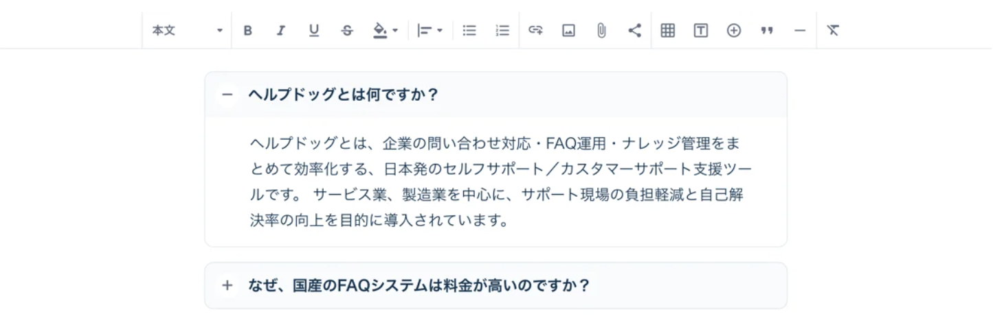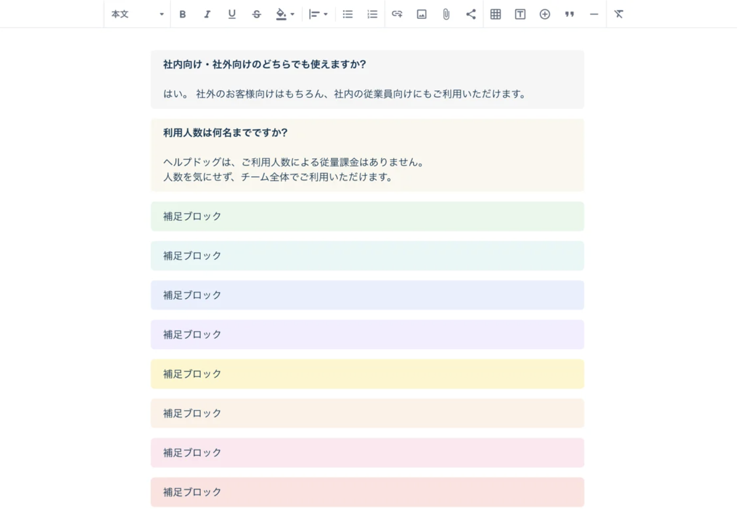 今回のエディタアップデートにより、情報の性質や伝えたい意図に応じた表現が可能となり、読み手が内容を把握しやすい記事構成を実現します。これにより、FAQサイトを利用するお客様だけでなく、社内向けFAQを参照する従業員にとっても、理解しやすい情報提供を支援します。