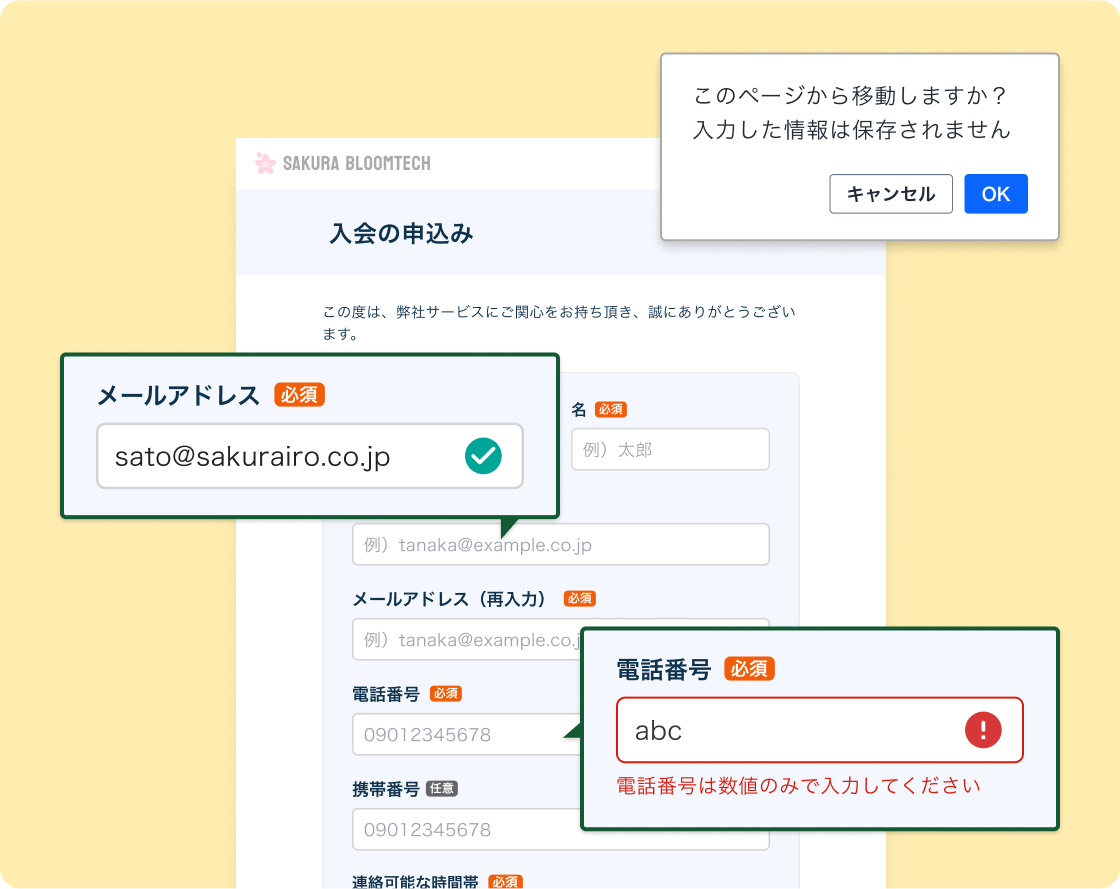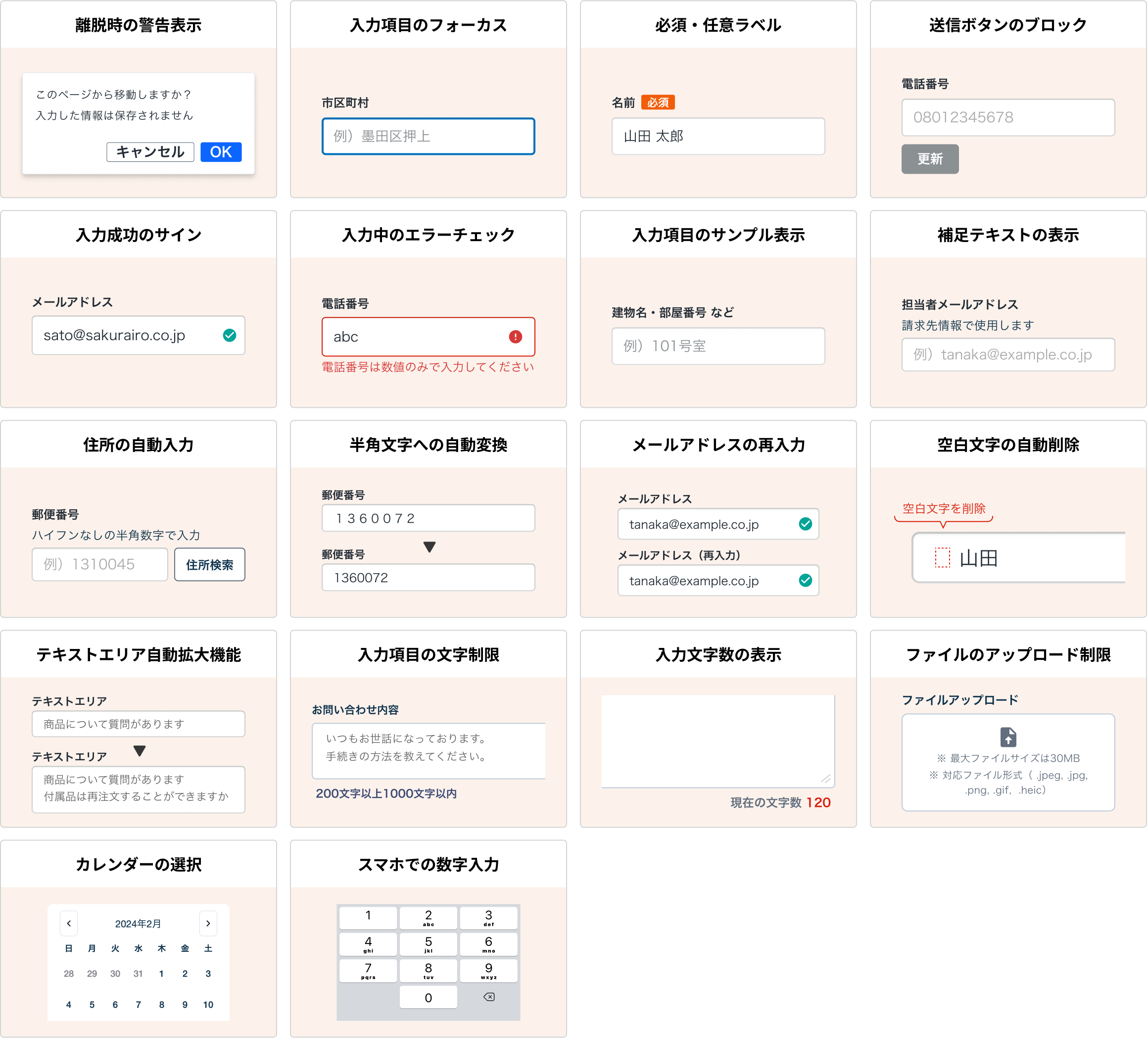 必須・任意ラベル フォーム入力中のエラーチェック フォーム入力成功のサイン 入力項目のサンプル表示 入力項目の強調表示 入力項目の文字制限 入力文字数の表示 送信ボタンのブロック 空白文字の自動削除 カレンダーの選択 テキストエリア自動拡大 スマホ画面での数字入力の最適化 フォーム離脱時の警告表示 ファイルの種類別アップロード制限 郵便番号による住所の自動入力 郵便番号、番地の自動半角化 メールアドレスの再入力 |