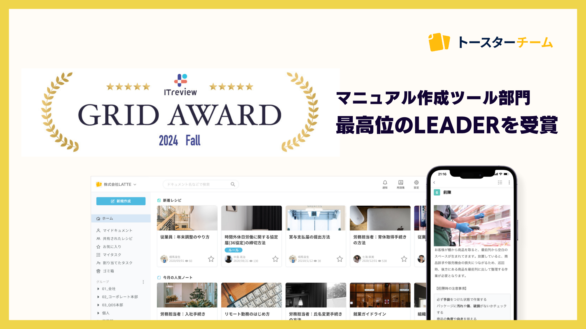 AIマニュアル作成ツール「トースターチーム」(https://toaster.how)はこのたび、アイティクラウド株式会社が運営するビジネス向けIT製品・クラウドサービスの国内最大級のレビュープラットフォーム「ITreview」において、「ITreview Grid Award 2024 Fall」のマニュアル作成ツール部門で最高位の「LEADER」を受賞したことをお知らせいたします。同部門では12期、3年連続の受賞となります。
